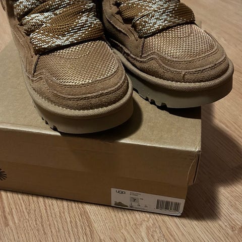 UGG Sneakers i størrelse 40 i beige farve. Skoene har en kombination af tekstil og ruskindsmateriale med pelsdetaljer indvendigt. Designet med brede snørebånd og en kraftig gummisål. Egnet til hverdagsbrug.