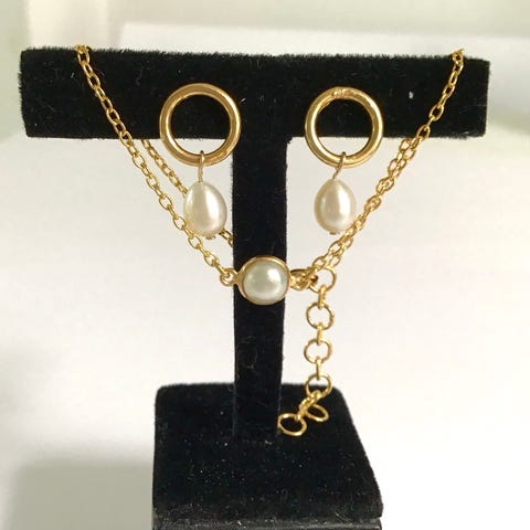 Smykkesæt. Armbånd og øreringe. Forgyldt sterling sølv. Ferskvands perler. Nye.