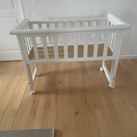 Troll Bedside crib. Sengen er designet til at stå ved siden af forældresengen og giver nem adgang til barnet.