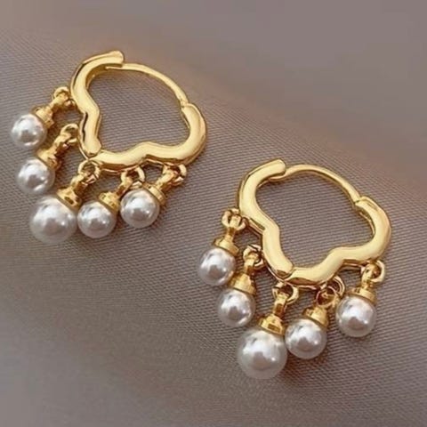 Flotte forgyldte øreringe med en hul cirkel med lange rækker af hvide perler. Ringen er 2,5 cm i diameter og den længste række perler er 5 cm. Perlerne er ikke ægte, derfor den lave pris. Øreringene er nye og de er meget lette, vejer få gram