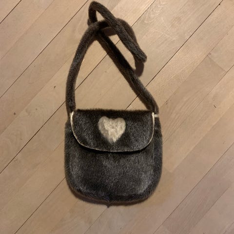Unik skuldertaske eller crossbag i antracitfarvet (mørk grå) sælskind (grønlandssæl). Tasken måler 23 cm høj og 26 cm bred. Indvendig foret med råhvidt møbellærred. 1 lynlåslomme og 3 ekstra lommer. Smarte detaljer så som et lille bamsehoved på lynlås-ende. Justerbar skulderrem af slidstærkt gjord på 4 cm i råhvid og grå. Pris kr. 600 plus porto. Eget design og eget håndarbejde.