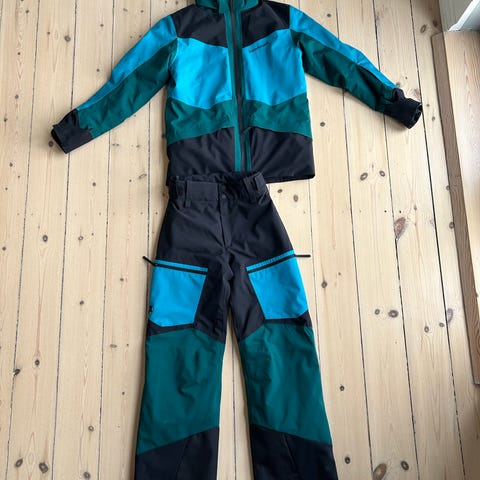 Peak Performance skijakke og skibukser i blå og sort farve. Jakken har lynlås og hætte, samt et mønstret panel på front og ryg. Bukserne er i matchende blå farve med lommer. Sættet er designet til vinterbrug og skiløb.