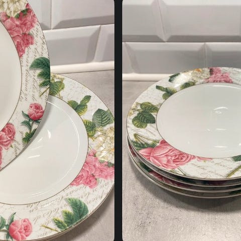 8 Stk. Middags tallerkner med roser på hele kanten sælges samlet for 100,00 kr. De er alle hele og finde uden skader og skår og har en diameter på 27 cm.