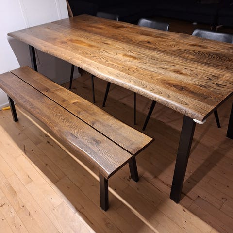 Ilva spisebord og spisebordsstol i cremefarvet læder med ben i træ. Stolen har et moderne design og er egne til hverdags brug. Sælges også hver for sig. 8stk stole. Bord mål se sidste billede.