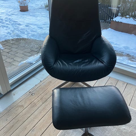 Hvilestol sort læder med elektrisk fodstøtte. Lænestolen har polstret ryg- og sædekomfort samt armlæn. Den elektriske funktion gør det muligt at justere fodstøtten for øget siddekomfort. Ca 14 måneder gammel købt i Daells bolighus.