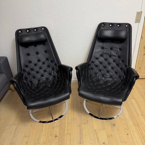 Jetson lænestol (produceret af DUX) tegnet af Bruno Mathsson sælges, da jeg desværre ikke bruger den nok. Stolen er virkelig lækker at sidde i, og den fylder ikke ret meget. Det er tilmed Jetson-seriens topmodel, udført i Dakota-skind i den flotte cognac-farve.