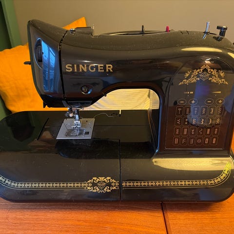 Singer symaskine med flere stingmuligheder. Maskinen har indbygget håndtag og en beskyttende hvid taske til transport og opbevaring.
