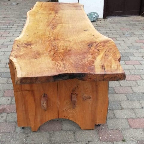 Rustikt plankebord . Bordpladen har synlige træårer og knaster, hvilket giver et naturligt og rustikt udseende. Passer til forskellige indretningstyper og kan anvendes som spisebord eller arbejdsbord.