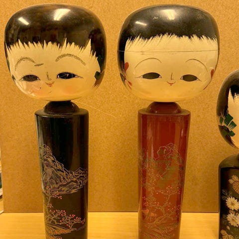 Dekorativ japansk kokeshi-dukke i malet og lakeret træ. Figuren er ca. 10 cm høj og har drejeligt hoved fastgjort med elastik, som det er typisk for denne type.