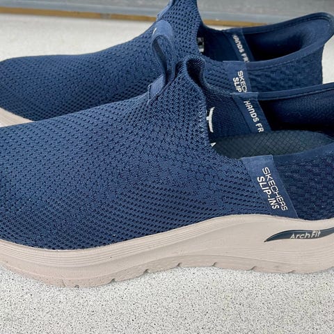 De er en str. 44, og brugt meget lidt. Der er dog et lille hul ved hælen på den ene sko.