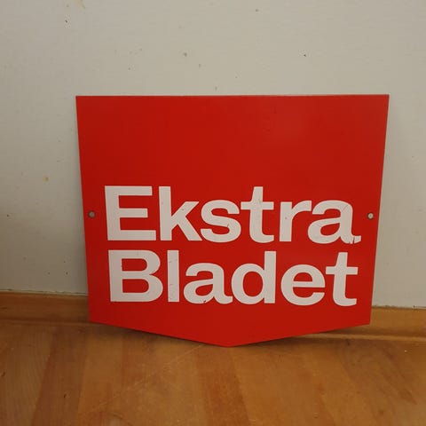 Politiken/Ekstra Bladet skilt i plast.H 26 cm, B 38 cm.Gå til varen, for flere billeder.(Reol 15).
