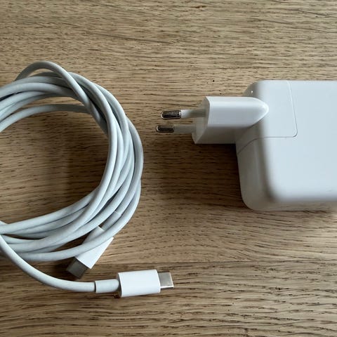 Der medfølger MagSafe 3 kabel som er kompatibel med Macbooks fra 2021 og frem samt et langt 230 V tilslutningskabel.