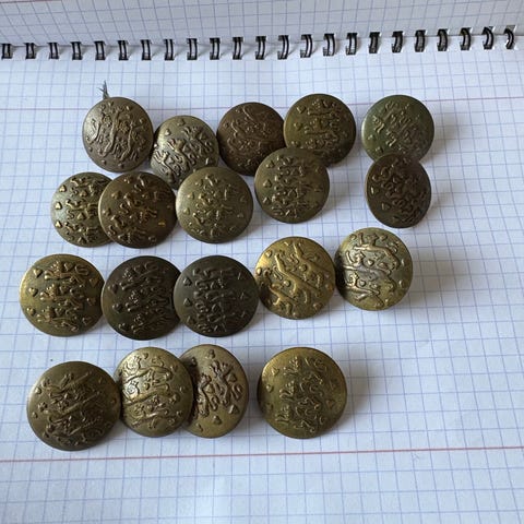 Sæt af gamle metalknapper med emblem. Knappestørrelserne varierer, og de har en rund form med et detaljeret emblem på forsiden. Knappene har en slidt overflade og en enkel bagside med hul til syning.