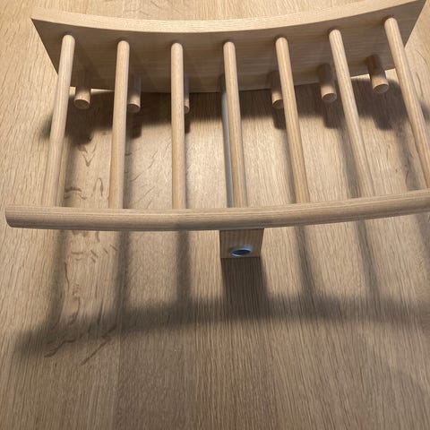 Fin og velholdt hattehylde/ knagerække i lyst træ, måske ask eller lign. 6 knopper til at hænge jakker på samt bøjlestang og hattehylde. Som ny.