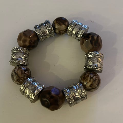 Armbånd med turkiseperler og “sølv” perler er på elastik snor.