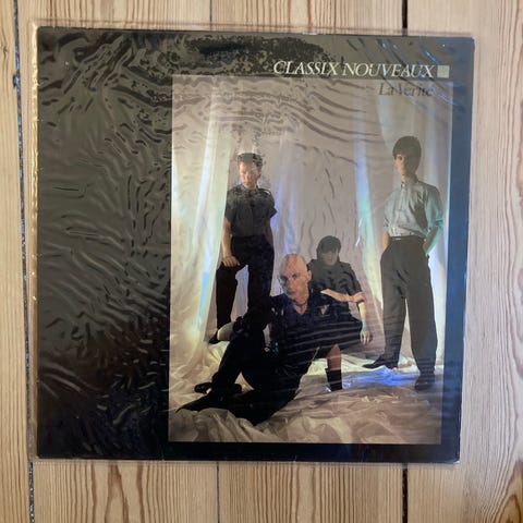 Classix Nouveaux Secret vinylplade med cover og bagsideillustration. Coveret har kunstnerisk design med tekst og billeder. Produktet er en musikvinyl med kunstnerisk visuel fremtoning.