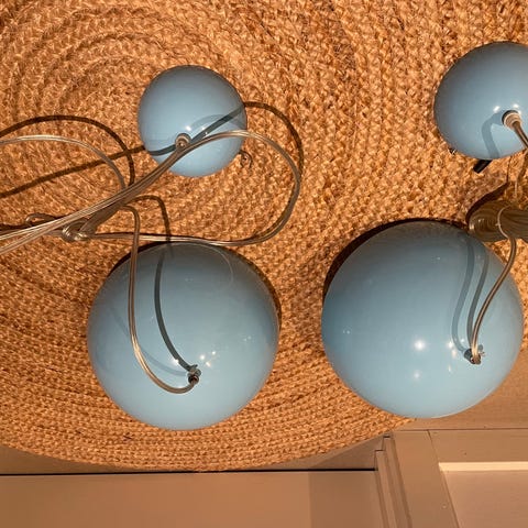 Lival Jumbo loftlamper med skærme i plast. Lampeskærmene er rillede og gennemsigtige, med ophæng i grå farve. Egnet til ophæng i stue, køkken eller andre rum. Sælges samlet eller hver for sig. Stk pris 250 kr.