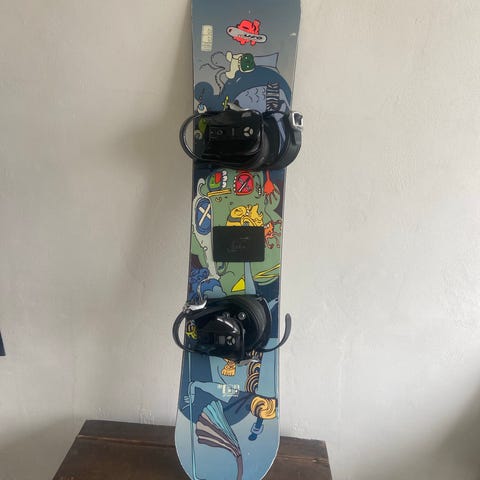 Salomon snowboard med tilhørende bindinger som desværre er gået i stykker i den ene binding, så de skal skiftes.