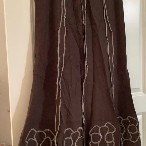 Brun nederdel lukkes med 8 lyse knapper, har 2 lommer foran med 1 knap og 2 lommer bagpå hvor der på den ene er 10 små knapper som pynt. L. 85 cm. Livvidde. 90 cm. Har Været på 1 gang.