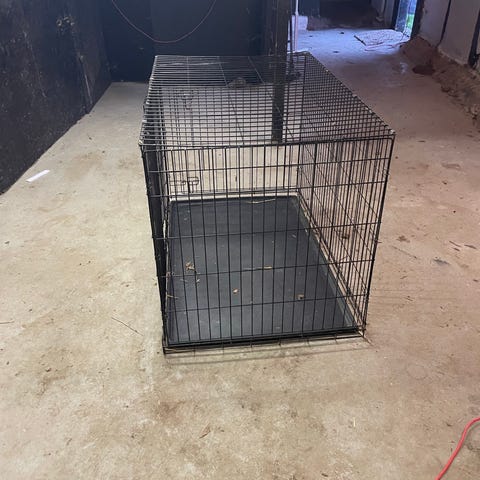 Sort metal hundebur med bakke