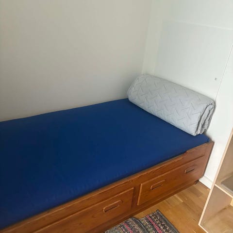 Fin gammel seng med madras og to skuffer under.