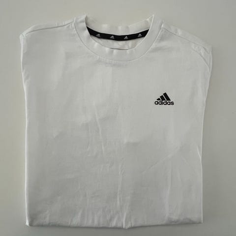 Adidas T-shirt til kvinder i størrelse S. T-shirten er fremstillet af bomuld og har farverne hvid og blå. Den har kortærmet design med rund hals og logo på brystet. Egnet til sport og fritid.