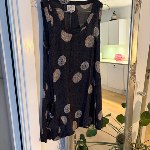 Kjolen har sidelommer og elastik i ærmerne ved håndled. Modellen har løst snit og svarer til str. M/L
