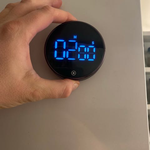 Køleskabsdør, hvor man indstiller timer ved at dreje. Drej forsigtigt, og den tæller sekunder op, drej hurtigt, og den tæller 5 minutter op. Købt fra Temu