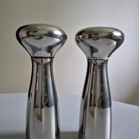 Georg Jensen Alfredo salt- og peberkværn i rustfrit stål med en højde på 200 mm. Sættet indeholder to kværne designet til salt og peber.