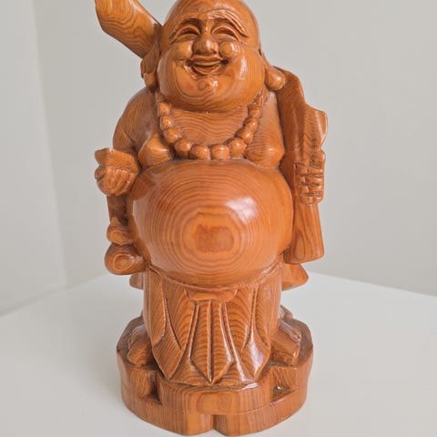 Skøn Antik signeret Happy Buddha i håndskåret træ