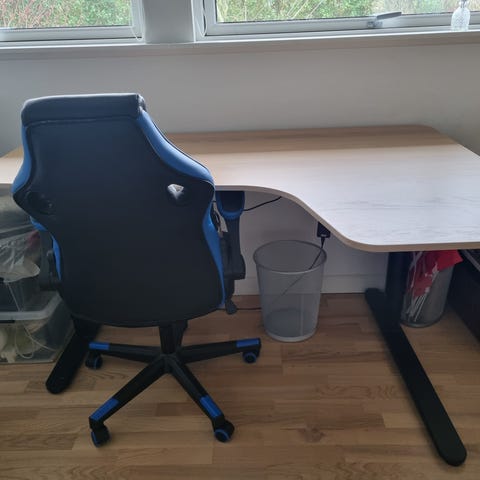Sort skrivebord med buet kant. 110 cm dybt på det dybeste, 80 cm på det smalleste sted. Kabelbakke under bordet.