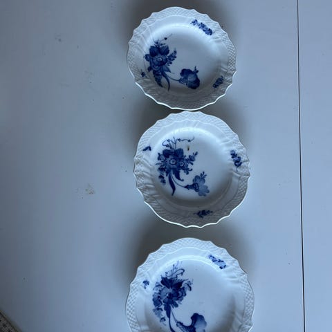 Royal Copenhagen Blå Blomst Svejfet tallerkner - se model og mål på fotos. Da tallerkner er håndlavet varierer mønster. Normal markedspris for en tallerken er 175kr, men disse sælges til en stærk samlet pris for alle 6.