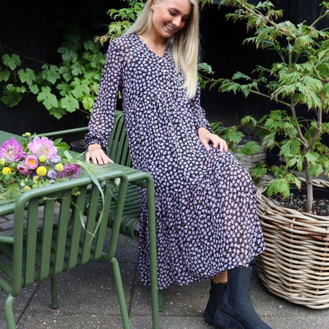 Smuk kjole med lidt abstrakt blomsterprint i skønne farver. Kjolen har bindebånd i taljen, lange ærmer med elastik og flæsekant ved enden og høj hals ligeledes med flæsekant. Der medfølger underkjole, der kan fjernes. BM kjolen er ca. 2x61 cm og BM underkjolen ca. 2x51 cm og lidt stræk. Længden målt fra nakken og ned ca. 115 cm 🌸