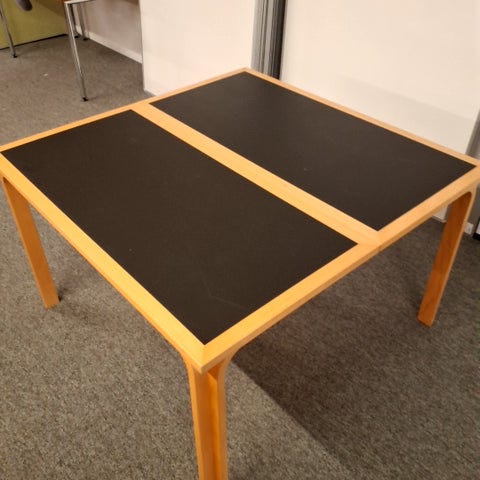 Bordet har en rund form med en sort linoliumsoverflade og en massiv træramme i lys træ. Benene er formbøjet limtræ og er stabile.