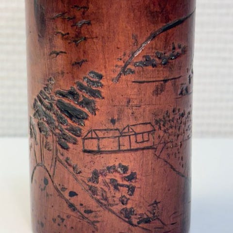 Sættet omfatter et dobbelt penselstativ udhugget, der forestiller Shoulao siddende under et træ.
