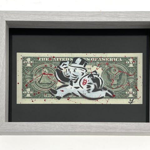 Market Crash Mr Monopoly x Dollar Art, et unikt 2025‑værk i mixed media af WhyCreationz på en original 1$-seddel, med stencils og akryl på sedlen, 19 × 15 cm, dybde 3 cm, edition 5, håndsigneret og signeret i pladen, inkluderer COA og er i fremragende stand. Klik på den blå "gå til varen" knap, for at købe eller byde på denne vare. Den samlede pris vil blive vist inden du afgiver dit bud.