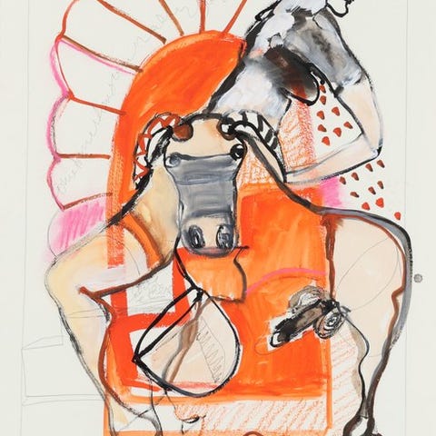 Smukt stykke af Eleonora Stol. Farverne er så levende og springer ud af værket. Det er blandet teknik på papir. Eleonora bruger forskellige materialer som akryl, blyant og olieverf.