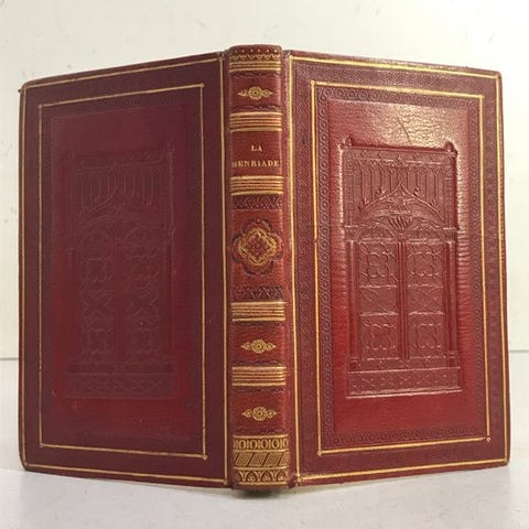 Et udvalgt eksemplar bevaret i en luksuriøs ældre bindingsværk udført i fuld maroquin med langt korn. Ryggen glat, titelstykke og mosaikrosetter i sort læder, gyldne riller der danner ruminddelinger. Gylden dekoration af en indramning på forsiderne, mosaikrosetter i hjørnerne. Gyldne snit.