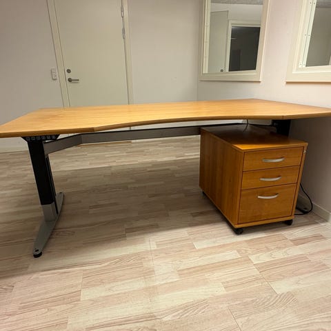 2 stk velholdte hæve/sænkebord i ahorn med sølvfarvede ben. Hæve/sænke funktionen fungere som den skal, og højden kan indstilles fra 70 - 113 cm.