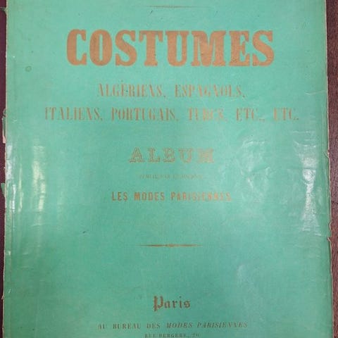 Paquet Frères. MNodes og historiske franske kostumer. Tegnet og gravurede efter de bedste mestre fra hver epoke og de mest autentiske dokumenter. Paris, Ved Bureaux des modes et costumes historiques, (1864). Ingr., øje, forsats med farvet vignette, s. 4 + 96 smukke plader på indgraveret og farvet karton (hver plade beskyttet af silkepapir). Fremragende eksemplar. Bind i kalveskind, snor, titler og ornamenter i guld på ryg og forsider. Guldkantede sider.