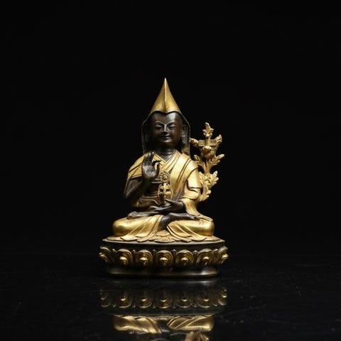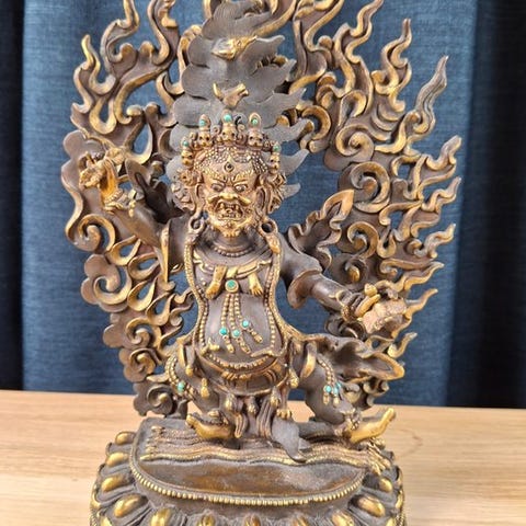 Tibetansk skulptur i forgyldt bronze fra det 20. århundrede, Vajrapani, højden 33 cm, bredde 28 cm, dybde 14 cm, vægt 4,5 kg, titel Vajrapani 33 cm / 4.5 kg, i god stand. Klik på den blå "gå til varen" knap, for at købe eller byde på denne vare. Den samlede pris vil blive vist inden du afgiver dit bud.