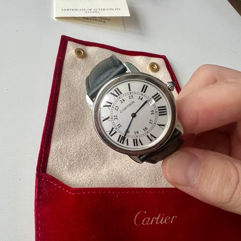 Til salg er dette smukke armbåndsur produceret af maison Cartier, model Ronde Solo XL, ref 3517.