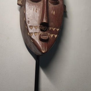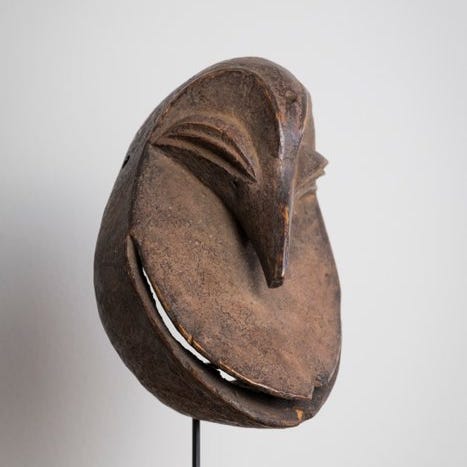 Máscara Hemba, en træ- og raffia maske fra Basuku del Norte i Den Demokratiske Republikken Congo, fra midten af det 20. århundrede, provenance privat samling, i god stand, højde 70 cm. Klik på den blå "gå til varen" knap, for at købe eller byde på denne vare. Den samlede pris vil blive vist inden du afgiver dit bud.