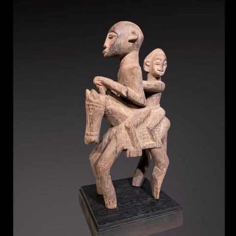 Dogon træfigur af en rytter fra Mali, 1940–1950, i god stand med enkelte slidmærker og alderspletter, høj 40 cm, bred 15 cm, dyb 30 cm, provenance privat belgisk samling, solgt med certifikat for ægthed. Klik på den blå "gå til varen" knap, for at købe eller byde på denne vare. Den samlede pris vil blive vist inden du afgiver dit bud.