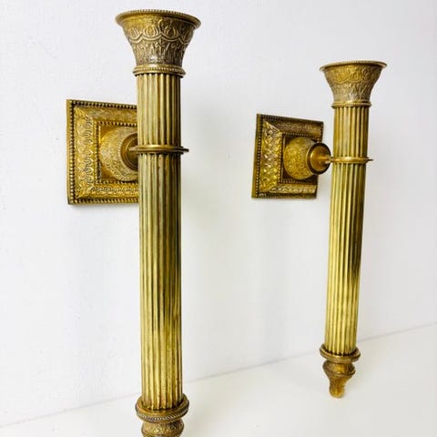 Mørkguldsbelagt italiensk floral Hollywood Regency væglampe, væglampe lavet af forgyldt, håndsmiddet metal med blade og blomster, dekoreret med 2 stearinlys, stearinlysd design, tidløs skønhed i vintage Rokoko-stil.
