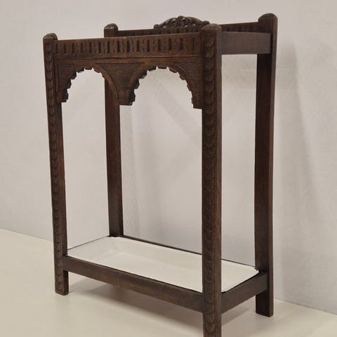 Et kobberparaplystativ, ofte brugt som et dekorativt element i entréen.