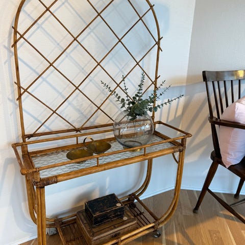 Elegant reol, bogreol i bambus, rattan og træfletning. Sidebord