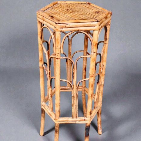 Bibliotekstrappe i træ med bambus, rotang og kurvvæv, fremstillet i Italien tidligt i 1950’erne, Art Déco/Colonial stil, 67 cm høj, 30 cm bred og 30 cm dyb, i fremragende stand, med yderligere titelinformationen Table à fleurs. Klik på den blå "gå til varen" knap, for at købe eller byde på denne vare. Den samlede pris vil blive vist inden du afgiver dit bud.