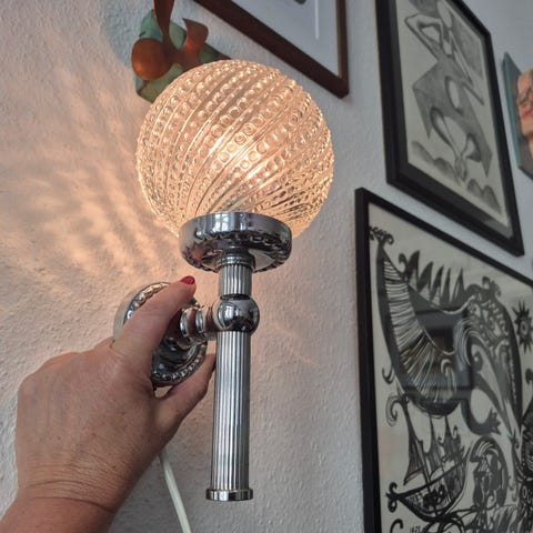 Vintage væglampe med mørkbrunt metalramme, blade og rosmotiver samt håndmonteret glaskvastube; glaskuglerne er komplette og i god stand, armaturet har noget lakskade især ved fatningen, bredde 28 cm, højde 26 cm, dybde 20 cm, med én fatning, oprindelse Europa, model druivenlamp, 1970–1980, i funktionsdugal. Klik på den blå "gå til varen" knap, for at købe eller byde på denne vare. Den samlede pris vil blive vist inden du afgiver dit bud.