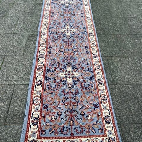 Håndvævet orientalsk tæppe i uld, uden centralt medaillon med blomsterdekoration, på blå og beige baggrund. Omkring en stor blomsterkant.